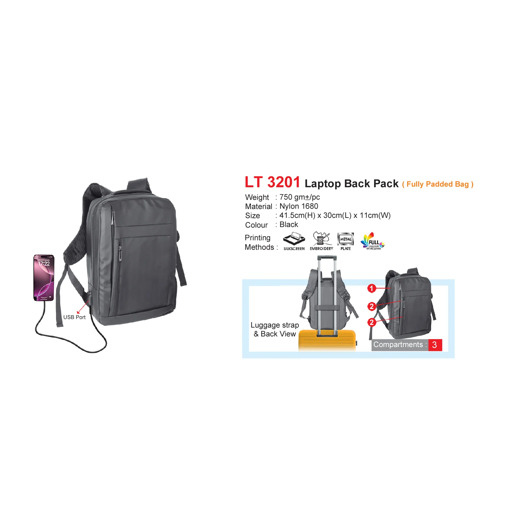 Laptop Back Pack (Fully Padded Bag) (LT3201)